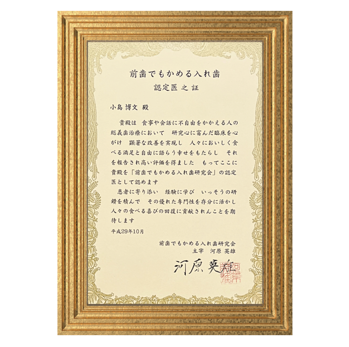 「前歯でもかめる入れ歯研究会」認定書