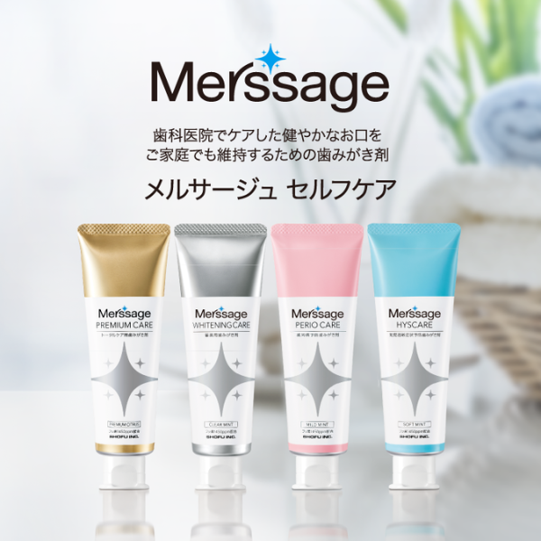 歯科医院でのケアを家庭で維持するための薬用歯磨き粉です。ホワイトニング、歯周病予防、知覚過敏、むし歯予防など、目的別のラインナップがあり、高濃度フッ素(1450ppm)がほぼ全製品に配合されているのが特徴です。