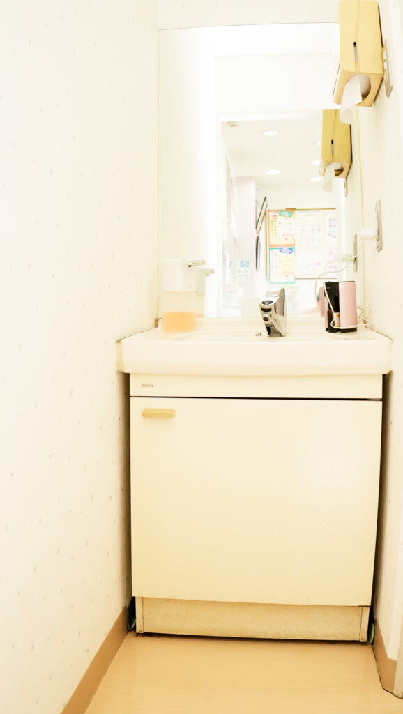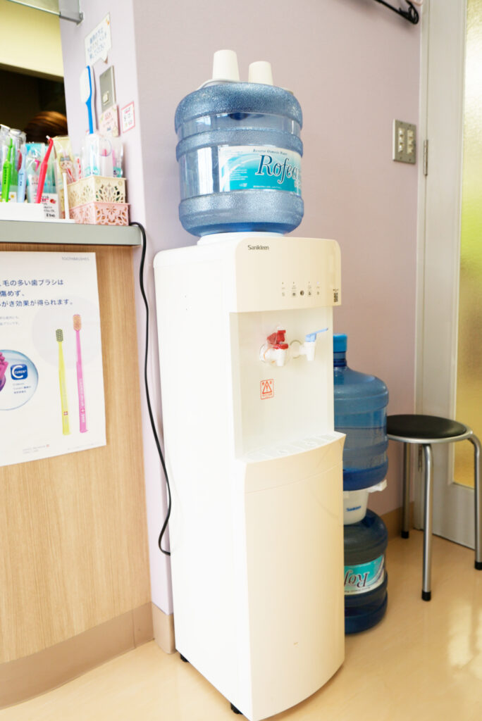 診療前後のお時間をくつろいでお待ちいただける明るく清潔な待合スペースをご用意しております。感染症対策の空気清浄機や手指消毒はもちろん、ウォーターサーバーも完備しています。また、お手洗いとは別に独立した洗面スペースを設けていますので、治療前の歯磨きやお化粧直しに気兼ねなくご利用ください。