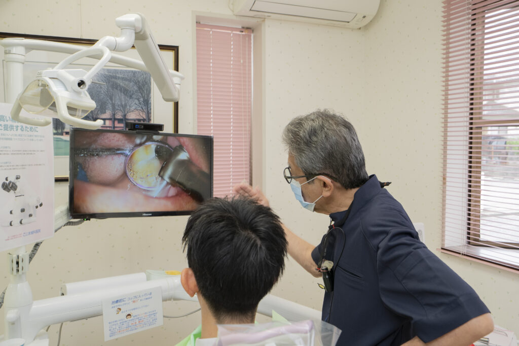 肉眼では見えない、数ミリ単位の微細な部分まで鮮明に拡大して確認しながら治療を進めます。