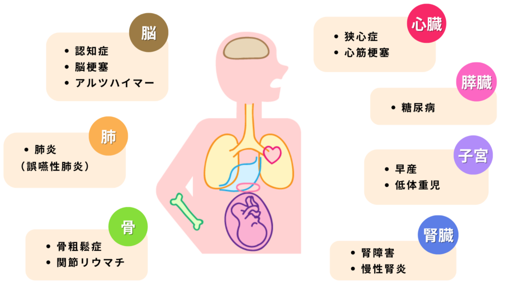 歯周病が進行すると、歯ぐきの血管が炎症を起こし、そこから歯周病菌や、菌が作り出す毒素・炎症性物質が血液を通して全身へと流れ出します。これらの物質が、体の各臓器や血管に悪影響を及ぼすと考えられています。