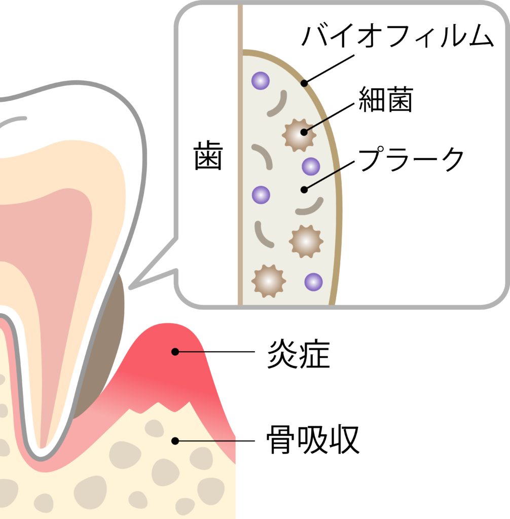しかし、実は歯石自体が原因ではありません。歯周病を直接引き起こす原因は、その前段階にある「歯垢(プラーク)」です。